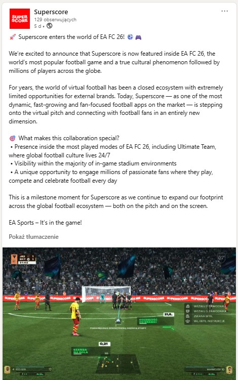 Superscore informacją o tym, że pojawił się w EA SPORTS FC 26 w formie elementów brandingowych pochwalił się w serwisie Linkedin. Logo aplikacji jest widoczne na bandach stadionowych oraz w najpopularniejszych trybach gry, gdzie codziennie pojawiają się miliony użytkowników.